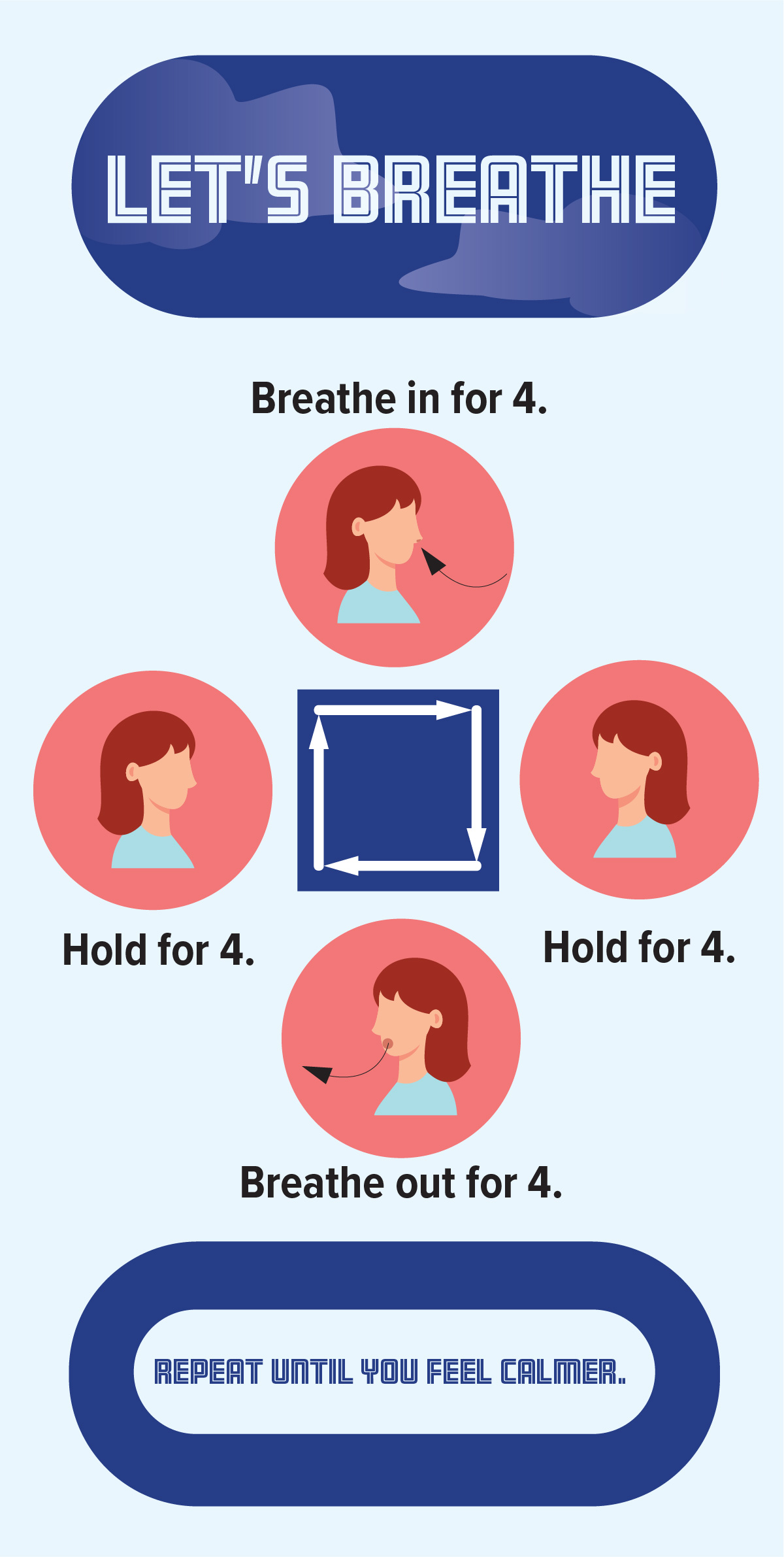 When worries come your way, a simple technique called "box breathing" to the count of four may help you relax and de-stress. It helps to find a quiet place to sit. But you can do this anywhere, whenever you need it.